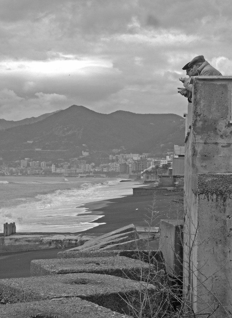 mi intriga il taglio,la volumetria, lo splendido contrasto tra la spuma delle onde e la morbida sabbia bagnata della battigia, e l'atmosfera.. cioè la presenza umana che contempla la forza del mare da un tranquillo riparo , come trincea.. la nebbiolina iodata che si crea nelle mareggiate effettivamente toglie contrasto.. questione di gusti.. a me piace, mi ricorda la salsedine che mi resta ovunque dopo una passeggiata in riva al mare burrascoso....