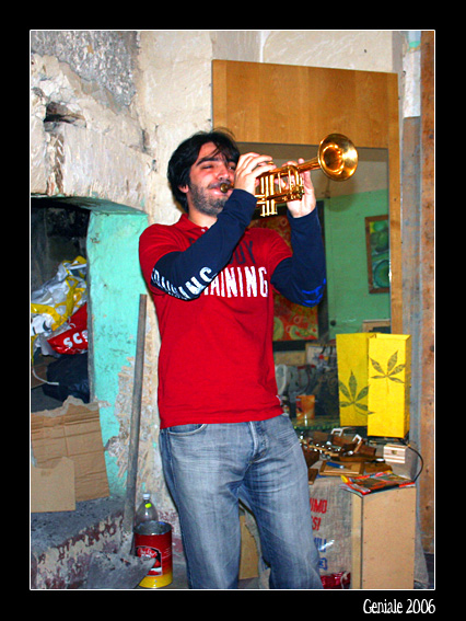 Sullo sfondo: mi piaceva l'idea di far vedere il postaccio dove stavamo suonando, proprio per contrappasso con lo strumento (solitamente un po' snob). Evidentemente non sono riuscito a rendere l'intento... Triste