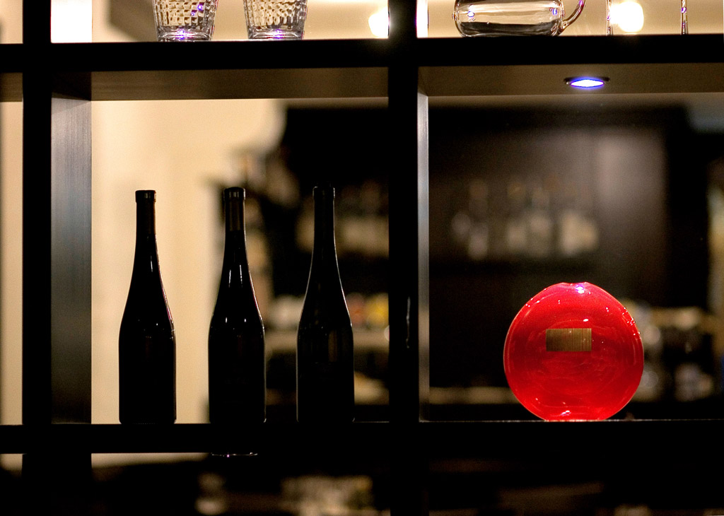 Un aspetto ancora sotto il controllo del fotografo che invece poteva essere più curato è la scelta dell'inquadratura. Salta all'occhio che la parte alta con i vetri, o veniva in qualche modo inserita tutta nella composizione (a livello di luce sembra la più interessante), o doveva essere tagliata. Basta fare la prova con lo 'scrolling' della pagina web per vedere come, tagliando a filo del ripiano alto, la composizione diventi decisamente più pulita.