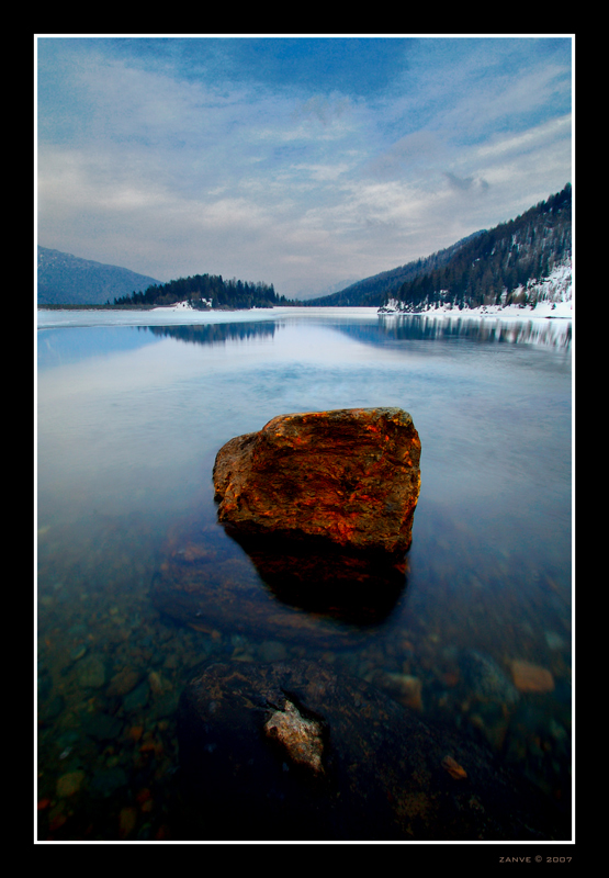 ...lo scatto mi piace molto per l'atmosfera che riesce ad evocare...ma, come sottolinei anche tu, trovo che il sasso, che è poi il soggetto principale, sia troppo centrato rispetto al fotogramma... Smile Smile