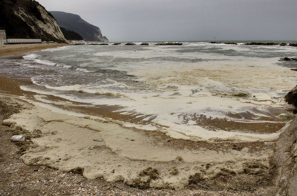 Intanto, visto che è un documento, ho voluto mettere in risalto il posto, a scanso di equivoci documentare ed evidenziare il posto credo che sia la cosa principale per questi tipi di foto, poi la schiuma centrale e quella ancora più evidente sulla battigia con tanto di bottiglia di plastica.