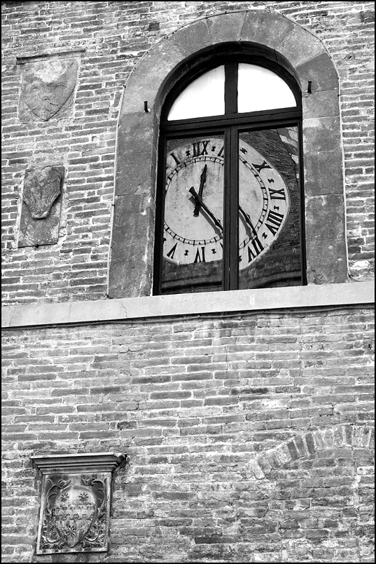 Che ben colpo d'occhio in questo B/n rigoroso.......l'orologio riflesso si deforma nel vetro di destra, come se i tempo, in un'altra dimensione , iniziasse a inclinarsi, sdoppiandosi, seguendo un ritmo suo proprio.......