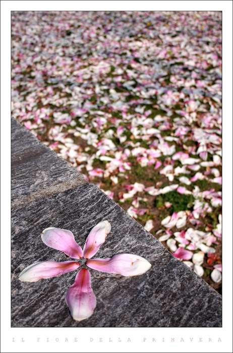 ciao marco, mi sono trovato di fronte a un prato ricoperto da quei petali di fiori caduti dall'albero... accanto al prato c'era quel muretto con sopra alcuni di quei petali... e allora ho pensato di usare alcuni petali per fare un fiore che rappresentasse quella miriade di fiori sullo sfondo... ecco! non c'è niente di pw!