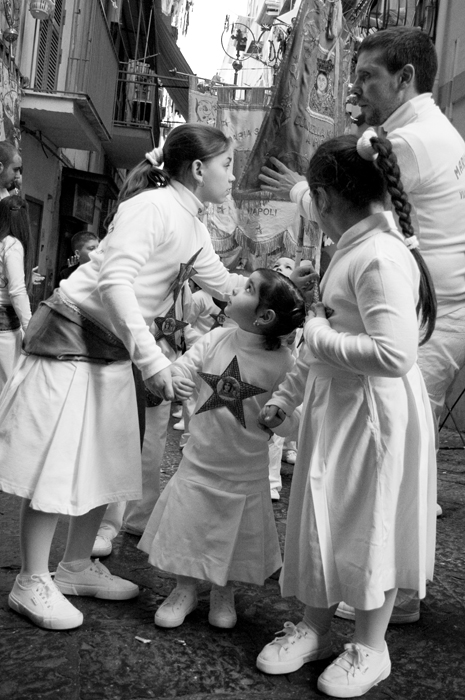 Fotogramma molto ricco e per certi versi un po' caotico. Si segue la traiettoria degli sguardi tra i vari personaggi (le bambine in primis), ma non si arriva a cogliere pienamente quello che si percepisce sta avvenendo nella scena. La non inequivocità del momento rende la foto un po' debole dal punto di vista narrativo. B&N efficace, con bianchi al limite, ma che conservano ancora un buon numero di informazioni.