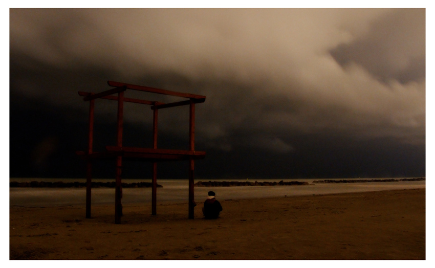 il cielo, il mare e la sabbia hanno queste tonalità così cupe che avvolgono la presenza umana, e la isolano in un'atmosfera unica.. chissà cosa attende, se la luce o la fine di tutto, con questa Apocalisse..