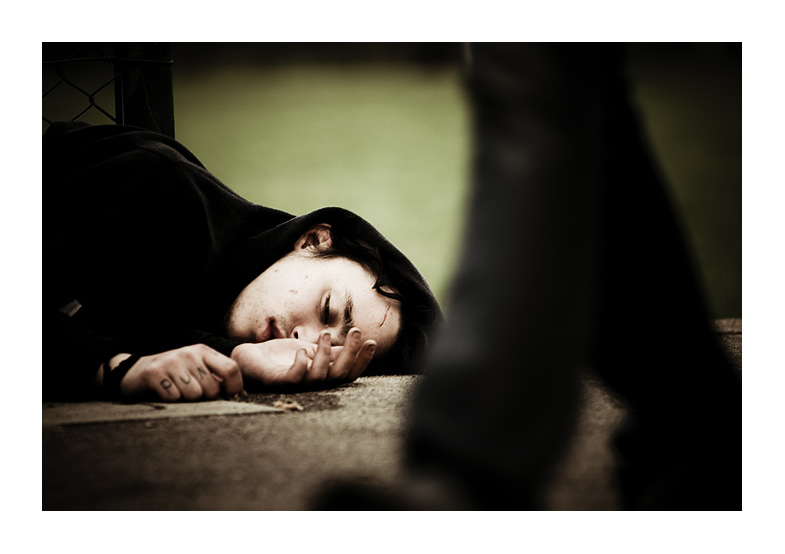 Il taglio deciso dato a questa composizione e' di notevole efficacia narrativa. Per effetto dello sfocato in primo piano e della ridotta profondita' di campo la figura inerme del ragazzo sembra proiettarsi violentemente verso chi osserva la foto, colpendo come un pugno allo stomaco. E qui interviene una sorta di disagio nell'osservatore che, insieme al forte impatto emotivo provocato dalla scena, avverte la necessita di conoscere il retro-scena. In questo senso ha fatto bene l'autore a 'rassicurarci' sulle condizioni di quel ragazzo. Una volta usciti da questo piccolo 'impasse' psicologico, si ritorna ad osservare l'immagine, soffermandosi sui tanti dettagli significativi, come la posizione delle mani, le lettere tatuate sulle dita, le unghie sporche, la cicatrice sulla fronte....
