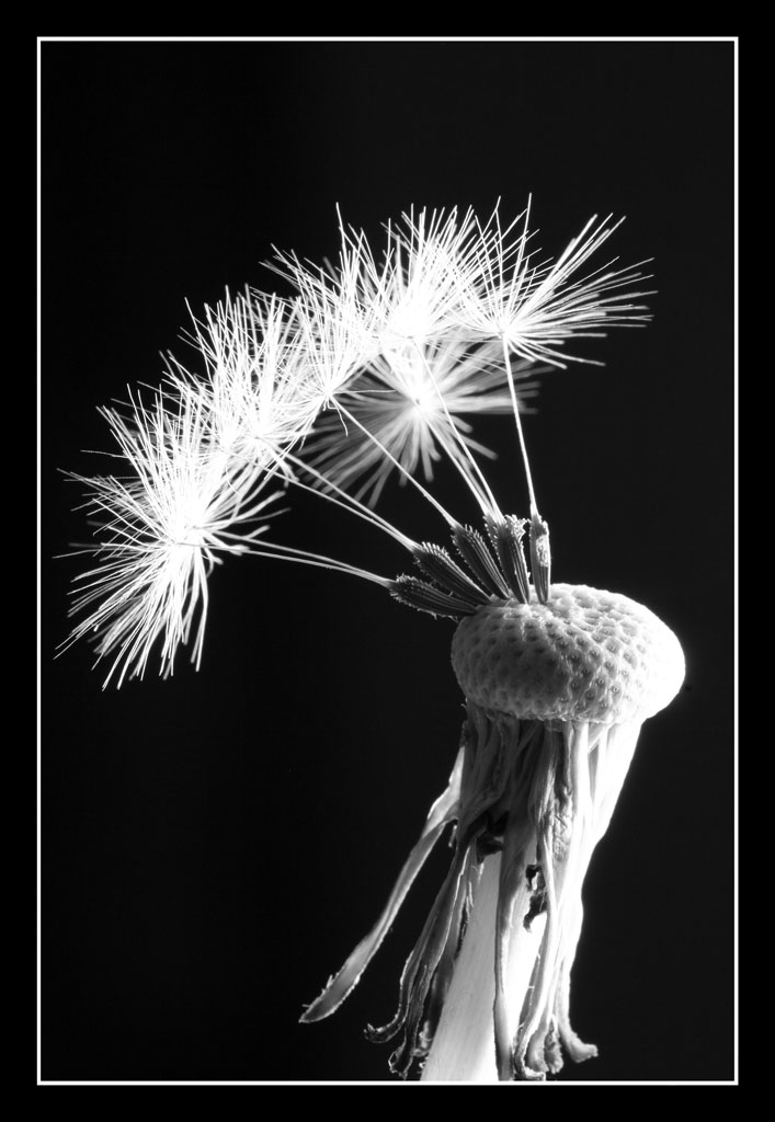 Attenta la composizione con la cima del gambo lievemente inclinata a dar forza alla direzione opposta dei capolini che sembrano scuotere il nero dello sfondo con la forza di mille scintille.