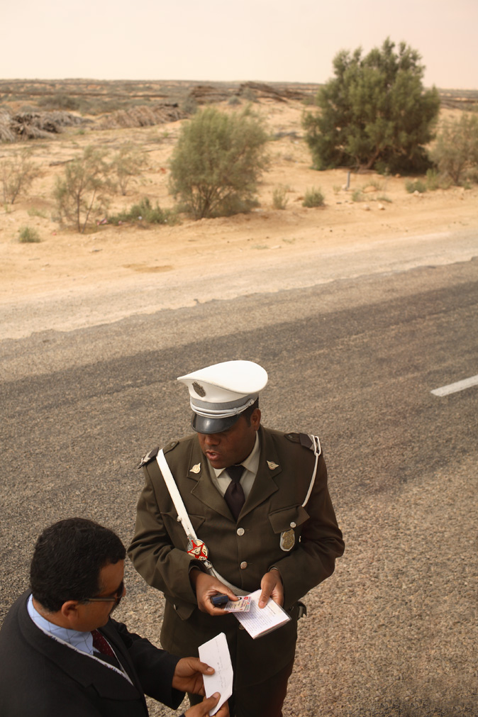 Discussione intensa, momenti di sincera preoccupazione dell'autista (non si è capito il motivo, forse qualche documento non proprio in regola...), lunghe telefonate con celluare del gendarme......Il tutto lungo una strada nel mezzo del deserto da cui l'inquadratura allargata e l'inclusione di alcuni elementi tipici dell'ambiente.
