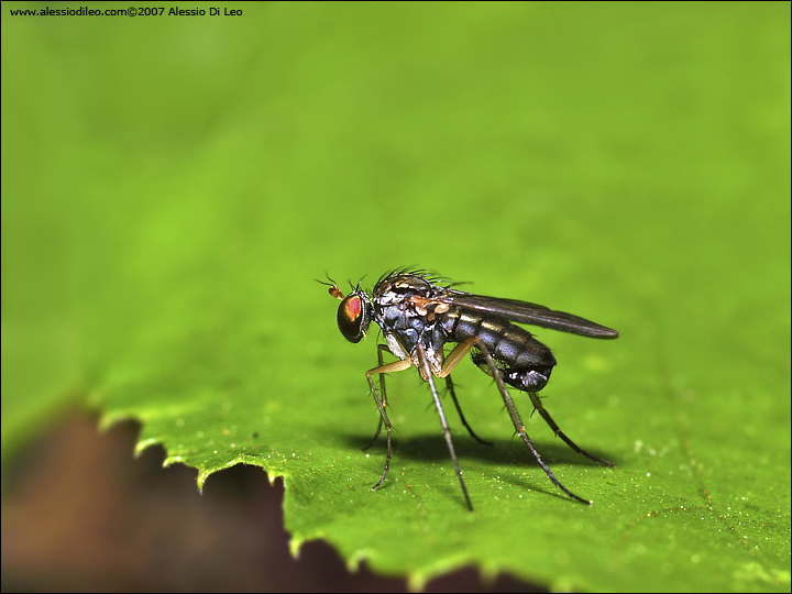 Smilzo per via delle lunghe zampe. Estremamente minuscolo come dittero, dovrebbe essere un Dolichopodidae, maschio per via dei genitali ricurvi sotto l'addome ....