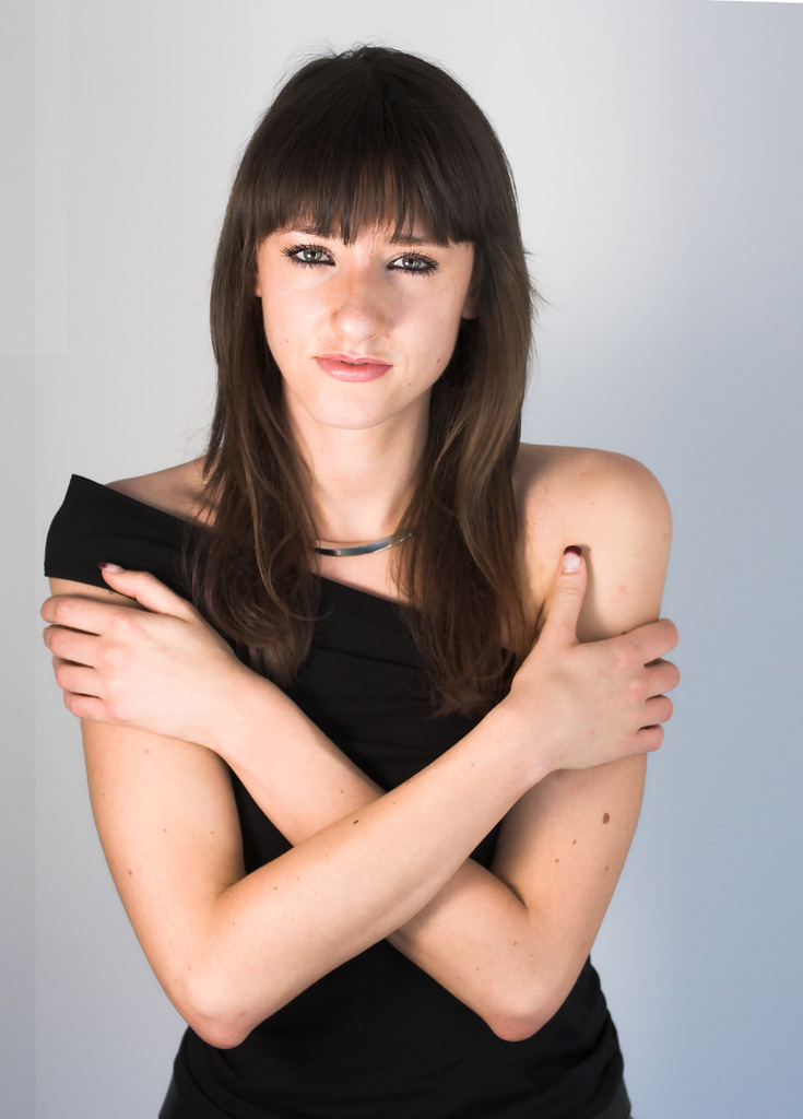 mi piace molto la posizione delle braccia...la spalla coperta e l'espressione del viso.....invece la luce è un po' forte ....