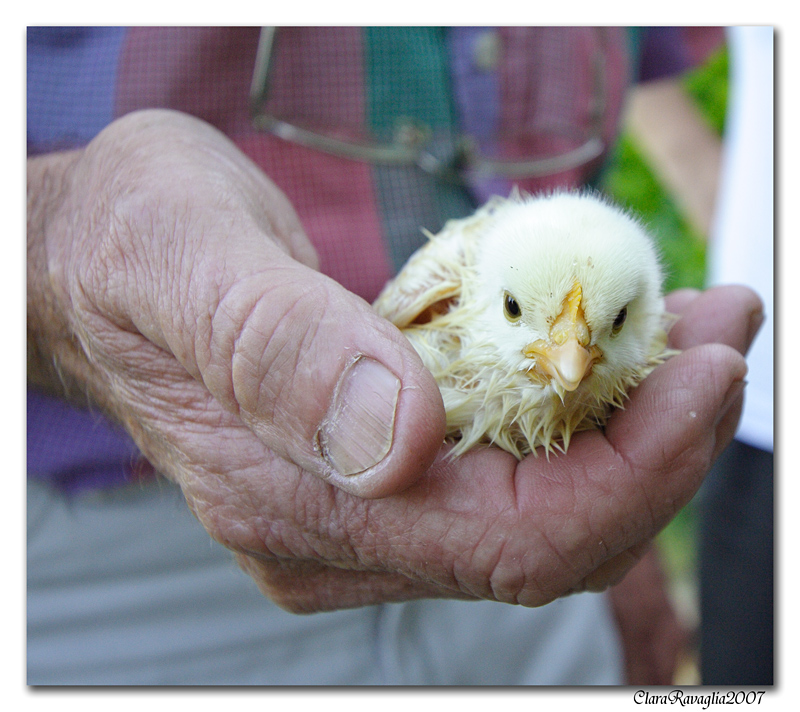 ..una mano umana che accoglie, salva, riscalda un piccolino pulcino ancora indifeso ma simpaticissimo nella posa..