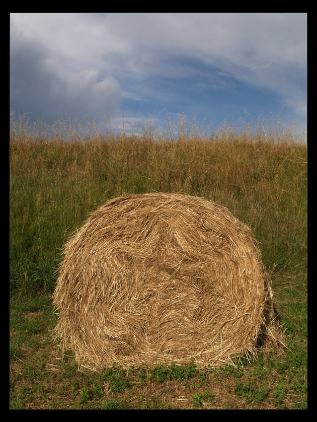 Una immagine con un soggetto così centrale ed uno sfondo così poco accattivante non mi entusiasma....poi una altra cosa; molti chiamano covoni queste che non sono altro che "rotoballe" in gergo tecnico-agrario.