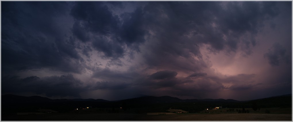 Affascina e rapisce di mistero la sua ombrosità temporalesca che pure dischiude generosamente la tenue teoria di sfumature del gradiente rosa/azzurro del cielo. Un'ombrosità che non ci spaventa però, di là di certi accenti drammatici, ...anzi, quella breve punteggiata di luci in basso ha il suono della tranquillità domestica al riparo dai "pericoli" del temporale.