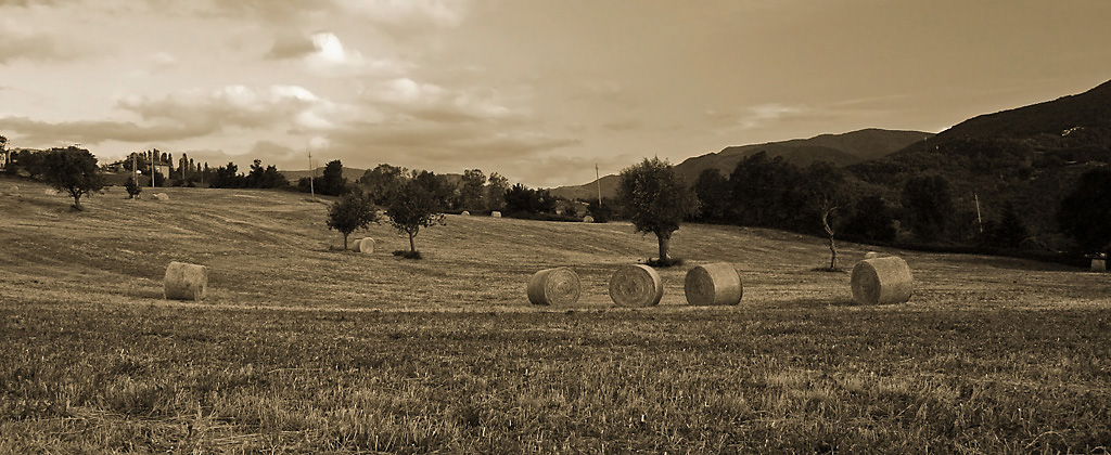 In questo scatto ci sono troppe cose e nessuna è valorizzata, le balle sono lontane, non staccano dallo sfondo, disposte un po' a caso. Case, alberi, pali del telefono disturbano la visione d'insieme. Le ombre sono molto chiuse e non danno quella sensazione di luminosità che ci si aspetta da una giornata di sole.