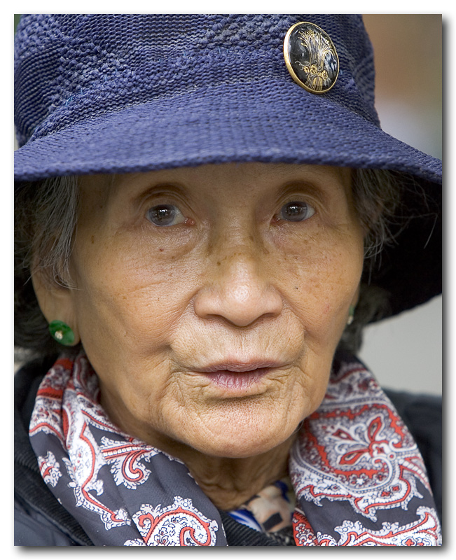 l'età della donna potrebbe far preferire il b/n , ma l'accostamento cromatico del cappellino e degli occhi non può eliminarsi....poi in b/n si perde quel celeste ceruleo liquido degli occhi...