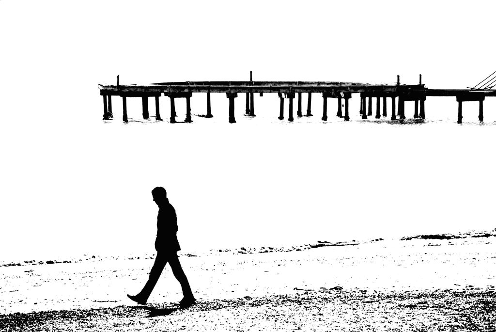 la figura perfettamente nera dell'uomo si staglia contro questo mare perfettamente bianco, senza nessuna increspatura.. sembra quasi che l'uomo cammini su di una strada, e non su della sabbia, come molto probabilmente è.. la piattaforma, con il leggero movimento dell'acqua alla base dei sostegni, riporta la scena vicino (o dentro) l'acqua..
