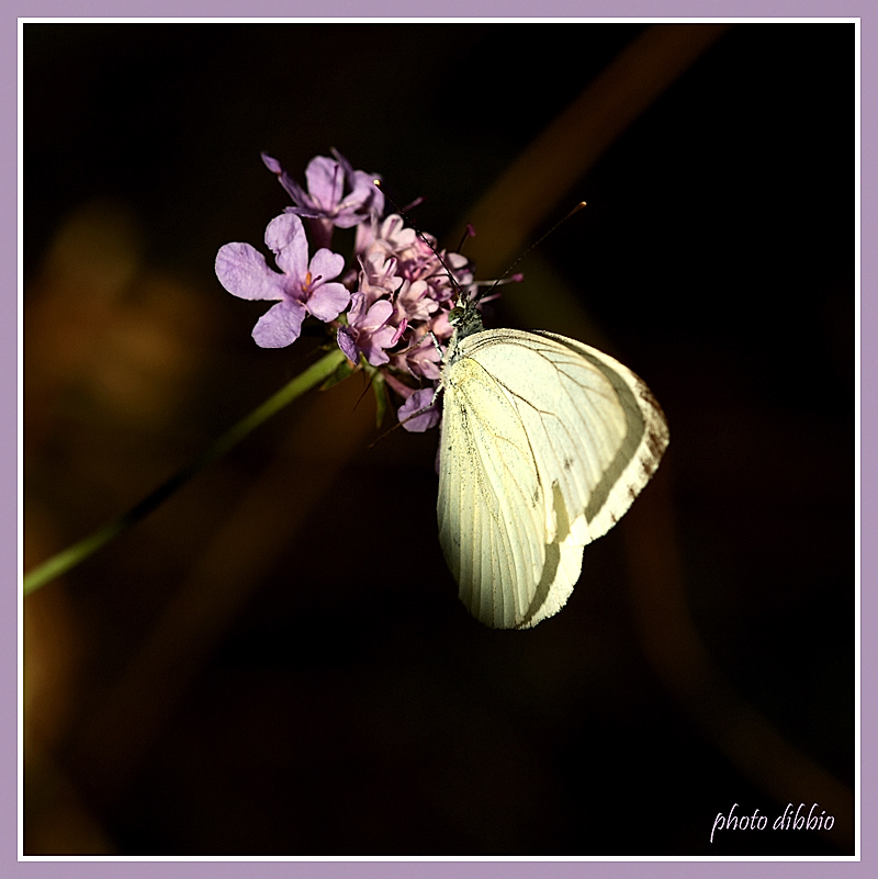 Bellissima la luce su fiore e farfalla. Bello lo sfondo che mette in risalto i soggetti.