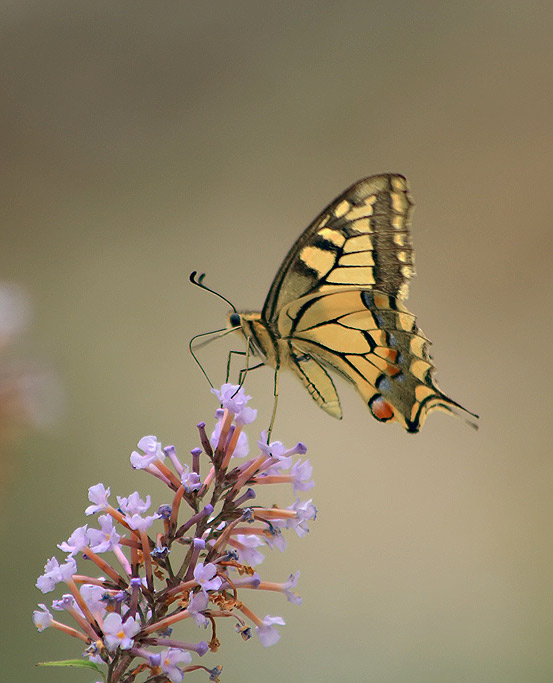 Bellissima farfalla, bello lo sfondo sfuocato e la compo, anche se migliorabile, avrei tagliato la parte di sx dal fiore in poi, il soggetto no è perfettamente a fuoco.