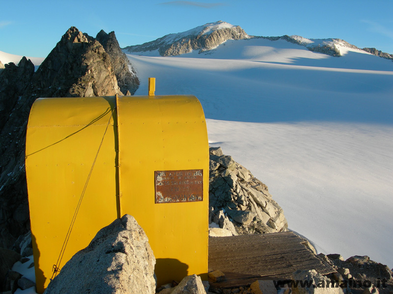 Ghiacciaio del Mandrone alle prime luci dell'alba. La cima dell'Adamello fa da sfondo al bivacco Giannantonj.