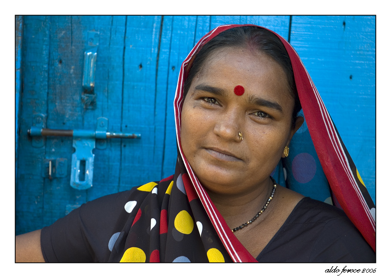 Splendido quel portone di legno turchese in dialogo con i puois del velo, che stacca il soggetto e si fa quinta uniforme contro cui contraltare il gioco delle cromie di nero, gialli, rossi e biacchi.