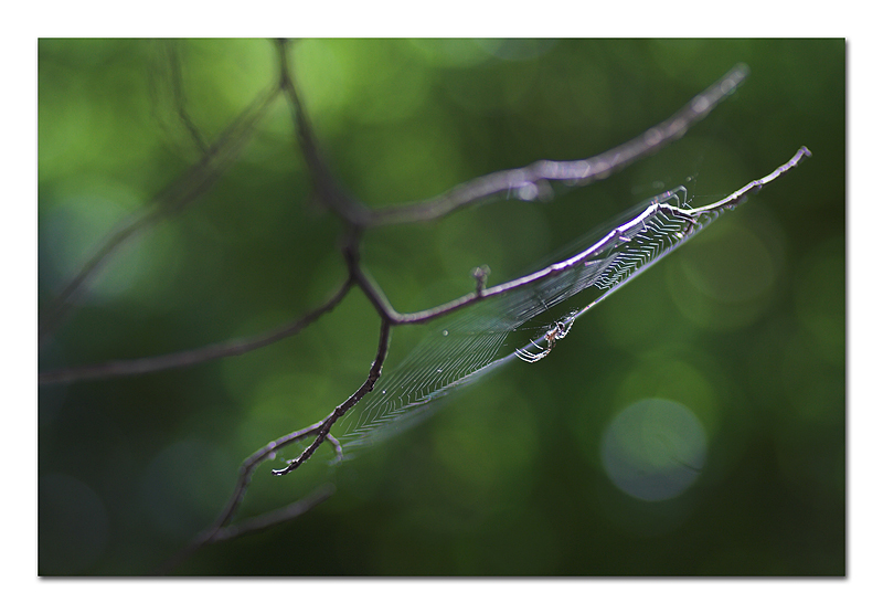 Bellissima compo con questo ramo che dà profondità alla scena e spettacolare la rasoiata di luce sulla ragnatela e il ragno. Il tutto in questo sfondo di luce filtarta e di ombra umida! Ottimo il flare nella parte bassa a dx, una luna pallida che per qualche strana alchimia sembra essere in grado di emanare la luce freddina che illumina il protagonista!