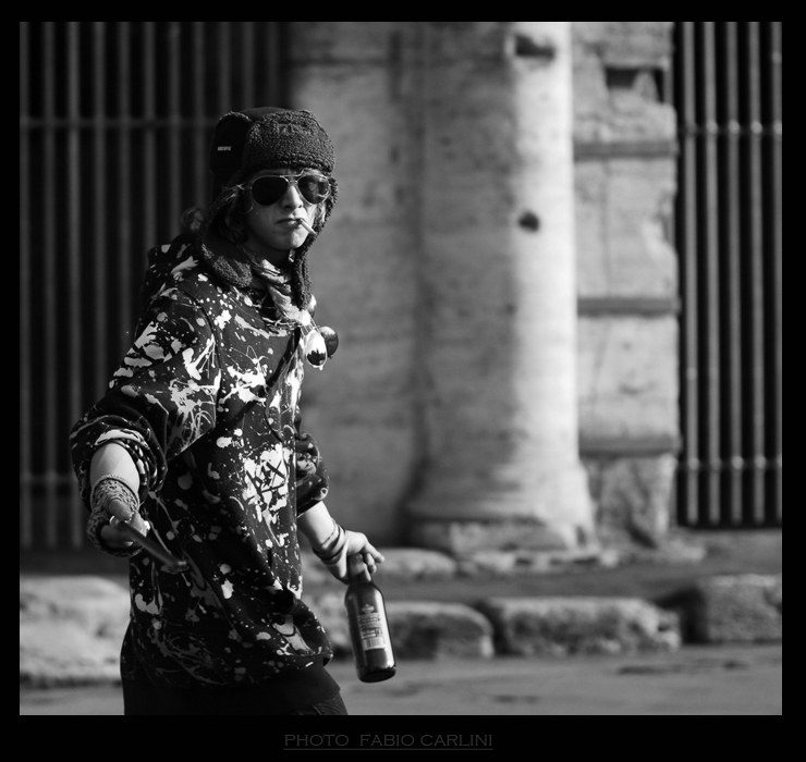 Non riesco a capire cosa abbia nella mano dx. Girando per Roma zona Termini verso il Colosseo con un pò di pazienza si trovano personaggi del genere. Bisogna vedere poi se sono disposti a farsi fotografare. Bravo per la prontezza della foto.