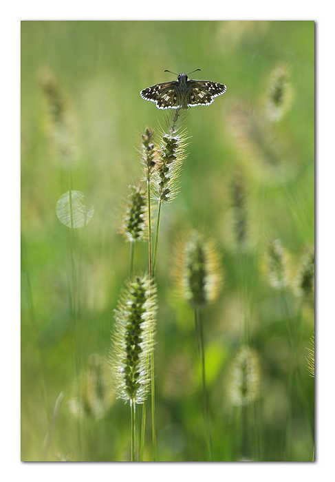 Ecco, la foto che ho cercato di fare ma che ho cannato in tutte le prove! Nelle mie ci sono tutti i peli delle spighe bruciati e la farfalla è nera, solo che quella che avevo come modella nella realtà era arancione... Mi arrabbio?