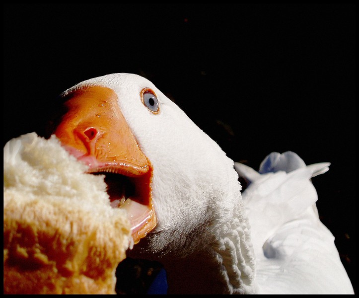 Stupenda, ottima idea imboccarla col boccone in primo piano, così sei riuscita a cogliere un espressione per così dire "animalesca", bello il contrasto tra le piume candide dell'oca col fondo scuro e stupefacente la nitidezza.