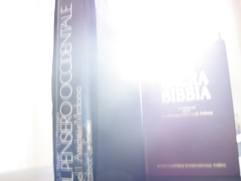 la foto rappresenta due "libri" su un tavolo. in qualche maniera volevo ricordare il legame stretto fra la religione cristiana e pensiero occidentale. lo sfondo bianco mi consente tre cose: eliminare lo sfondo per evitare fastidiosi oggetti dietro il tavolo, evocare Dio con una luce bianca molto forte come spesso faccio nelle mie foto e in terzo luogo per evidenziare la crisi in cui si trovano entrambi questi "libri". lo scolorirsi di questi due elementi dal mio punto di vista non fa bene all'uomo. ovviamente è un punto di vista molto criticabile e poco comprensibile nella foto, ma mio! può essere una foto non realizzata al meglio, con una capacità tecnica non eccelsa ma non credo si possa definire banale.