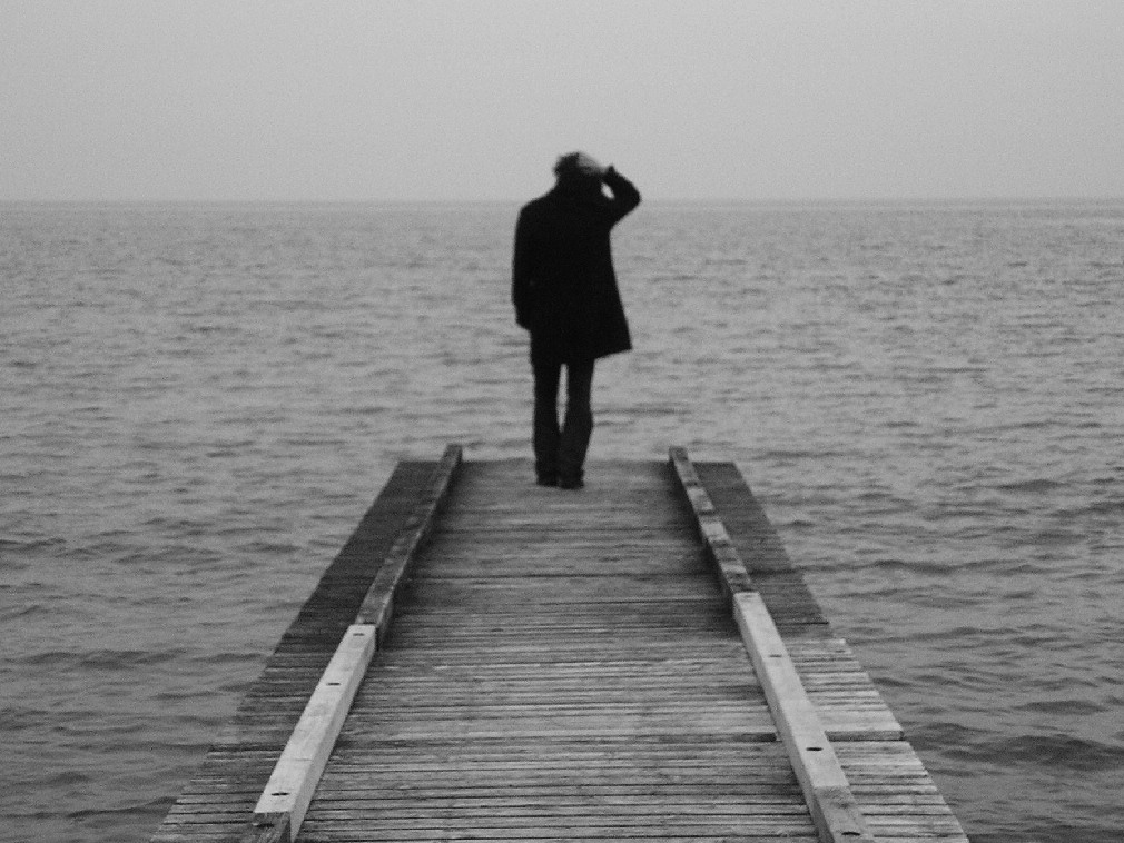 si respira una certa inquietudine, grazie a quel gesto, quella mano passata sulla testa.. questa scena così catturata, questo b/n così regolato, e la presenza solitaria in fondo ad una passerella che si ferma nei pressi del mare..