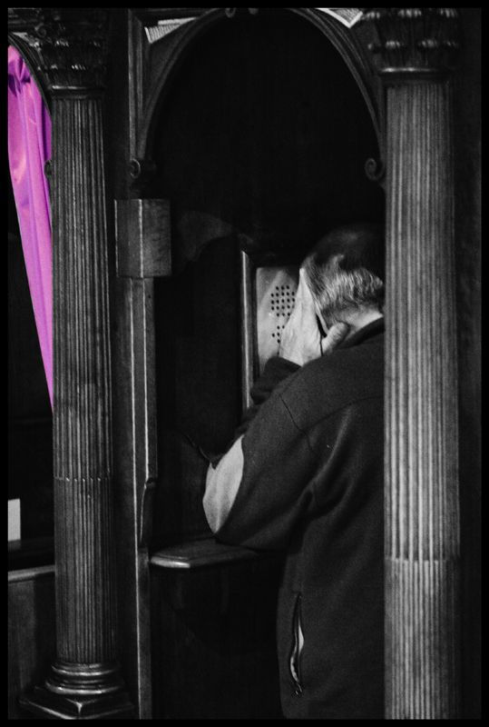 Il problema in questa foto non è il b/n, ma piuttosto il colore, o meglio quello che è stato lasciato a colori. La mia domanda è: perchè hai voluto che l'occhio dell'osservatore, anzichè focalizzarsi sulla persona in raccoglimento al confessionale, sia attirato dal drappo viola in posizione del tutto marginale nell'inquadratura?