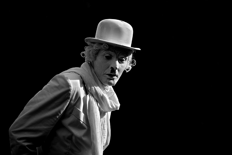 Gli artisti di strada si prestano molto alle scene in b/n, mi sembra un ottima fotografia, lo sfondo nero più da artista di strada dà una sensazione di artista da palcoscenico illuminato con adeguate luci, ciò significa che hai curato molto bene la luce.