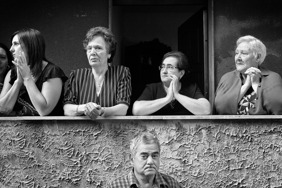 Incominciamo il commento della fotografia con la lettura delle informazioni materiali: si identificano concettualmente sei figure umane, cinque donne ed un uomo. Abbiamo la presenza di un muro grezzo, dove sono impresse le spatolate del cemento e sullo sfondo la porta d’entrata di una unità abitativa. L’autore scatta da vicino, ad altezza occhi, frontalmente ai personaggi, che appaiono ripresi in modalità "mezzo busto": quattro donne superiori dietro il muro di cemento spatolato, e l’uomo inferiore, ripreso con un "primo piano", creato dal taglio fotografico. Sull’estremità sinistra dell’inquadratura appare un emivolto di donna, che si trova su di una linea posteriore ai quattro mezzi busti di donne. Tutte e quattro le mezze figure vengono riprese con il gesto comune delle braccia appoggiate con i gomiti al piano del muro e delle mani raccolte. Tre delle donne vengono riprese di tre quarti, mentre guardano verso il lato sinistro dell’inquadratura verso qualcosa di non visibile. La donna con il vestito a righe e l’uomo del piano inferiore guardano in camera ed attivano un fuori campo speciale che interroga lo spettatore. Ed è proprio da questa traccia evidente dell’enunciazione fotografica che parte la lettura dell’istantanea. Un’interrogazione pressante che chiama in causa l’autore e sembra domandargli un perché. I due individui riescono a magnetizzare l’attenzione dello spectator che li studia e cerca di estrapolarne i caratteri fisiognomici, le singole identità. Così come vengono passati in rassegna anche i volti delle altre figure, alla medesima ricerca di tratti specifici, fisiognomici, ancora di identità singole. Ma è proprio in questo lavorio psicologico continuo che affievolisce progressivamente l’idea delle singole identità a favore della nascita di una nuova e più pregnante “identità collettiva”. Si respira una sorta di dialettica fra i singoli volti ed un soggetto fotografico che appare invece “collettivo”. Le pose ritmiche e le attitudini corporee cercate dal nostro Penna, la comunione di gesti, amalgamate alle connotazioni di un titolo aperto, regalano i segni di questa “identità di gruppo”. Utile in questo senso, viene la definizione che gli psicologi sociali danno dei “gruppi”, coniata da Karl Polanyi, che distingue due tipi di aggregazione: il “gruppo” vero e la “comunità”. Un gruppo si costituisce quando gli individui che si congregano hanno interessi uguali, ma valori etici diversi. Una comunità si costituisce quando gli individui che si congregano hanno valori etici uguali, ma interessi differenti. Quelle mani unite in preghiera sono il segno di una comunità unita e tutto questo “soggetto collettivo” appare come un unum intorno a quel muro spatolato, all'interno di questo spazio intimo davanti alla porta di casa, esprimendo un valore per sé e per tutta la collettività cui fa parte, un valore religioso e sociale dal quale tutti gli appartenenti sembrano essere investiti. Ed è proprio quel doppio debrayage enunciazionale che domanda allo spettatore se vuole far parte di questa comunità, se vuol condividere gli stessi valori, le stesse tradizioni, di invocare le stesse “preghiere”. Il nostro Penna, sensibile all’alterità del momento, si presenta con atteggiamento umile, per porsi in ascolto. Ancora una volta il fotogramma dell’autore rivela un desiderio profondo di entrare in contatto con altre identità, consapevole che attraverso questo profonda curiosità , oltre a sviluppare maggiore coscienza della sua identità, diventerà più ricco, delle alterità riconosciute. Davvero un buon lavoro. L’unica nota tecnica è il taglio a sinistra, con la presenza di quell’emivolto di donna che lascia un senso di incompiuto.