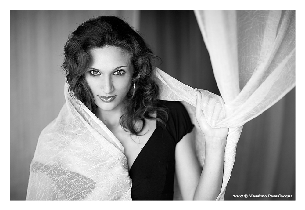 | Gran bel ritratto. Lei ha uno sguardo molto intenso, le luci sono perfette ed equilibrate. Mi piace molto la posa con il volto leggermente abbassato ed il gioco della tenda che lascia intende un "nascondino". La posa poi è funzionale alla composizione della foto "ancorando" il soggetto all'angolo destro superiore. |