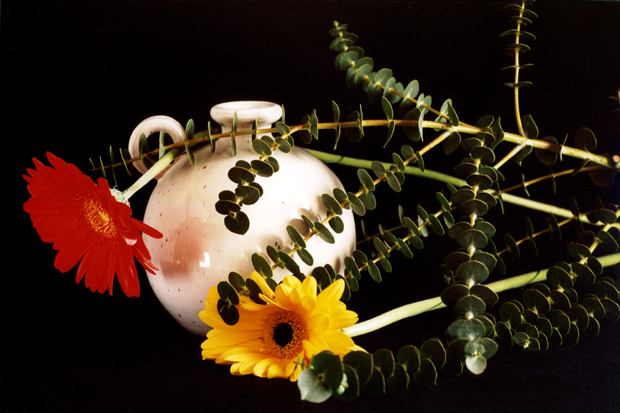 La gerbera rossa è troppo satura: si perde il dettaglio, i riflessi sulla brocca non sono il massimo e le rame troppo lontane e troppo vicine sono sfocate. L' immagine è squilibrata, tutto a sx, manca un punto di fuga o di interesse...