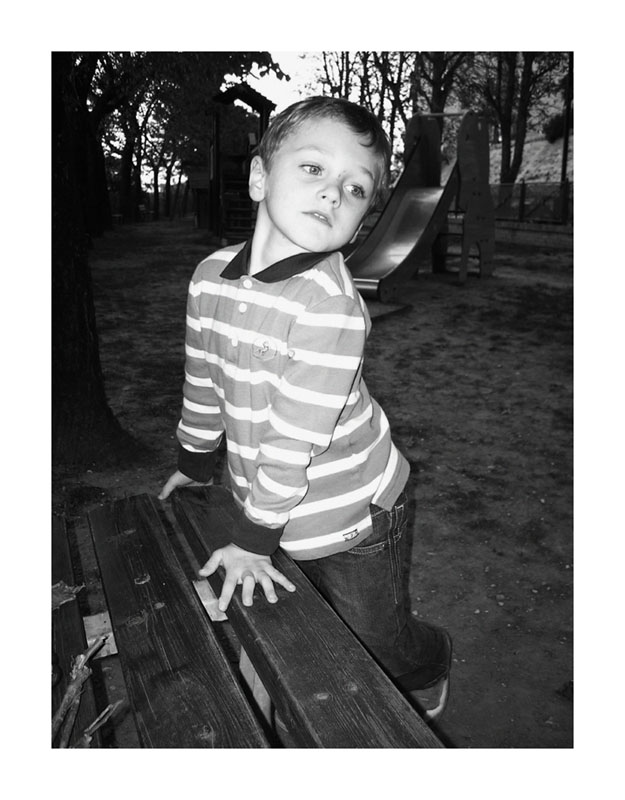 Un bel momento colto, si legge spontaneità infantile in una posa che in un adulto sarebbe assolutamente forzata. Poi è veramente indovinata la presenza di una penombra densa tutto intorno alla figura...... Credo che tu abbia usato il flash e la sua presenza è prepotente.... ma in questo caso può essere funzionale alla posa colta.... come un attimo di teatralità spontanea. , inconsapevole, se così posso esprimermi... paradossalmente da te catturata come sotto i riflettori.....