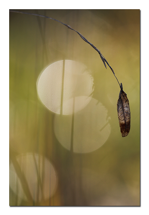 Beh, la tua è decisamnete più autunnale grazie allo stelo che descrive questa parabola discendente. Ci si aspetta da un momento all'altro un leggero refolo di vento e lei che, leggera, si stacca e scivola giù. Hai colto l'attesa di questa foglia a fine stagione, mi piace l'idea di lasciarla scostata, in posizione marginale, trovo che questa posizione le infonda ancora più grazia e dignità.