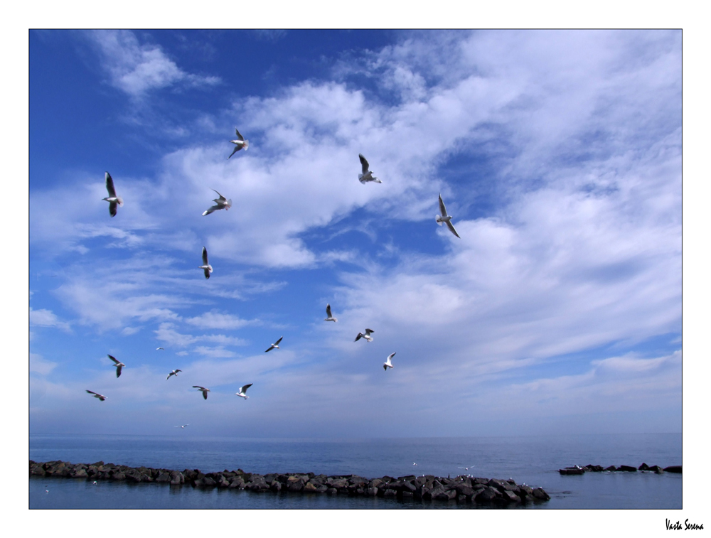 Bello questo insieme di gabbiani, che volano liberi nel cielo, riempiendolo e regalando un movimento allegro.. mi colpisce soprattutto il primo a destra, così incredibilmente nitido e catturato cone la sua massima apertura alare..