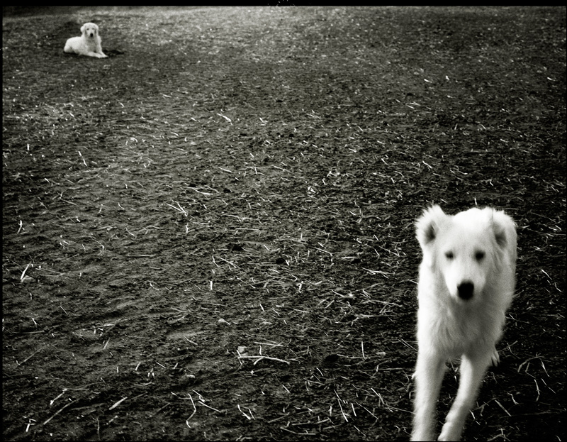 Il dinamismo dato dal mosso, l'inquadratura che nel rilievo scuro della terra inserisce il primo maremmano in piena e dinamica corsa ed il secondo sullo sfondo placidamente accucciato.