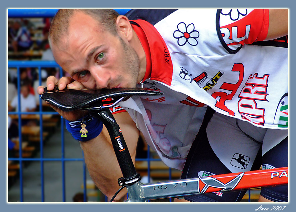 dopo 5 ore e 30 di gara mi pareva giusto ringraziare con un affettuoso bacio la mia bici che mi ha portato all arrivo...