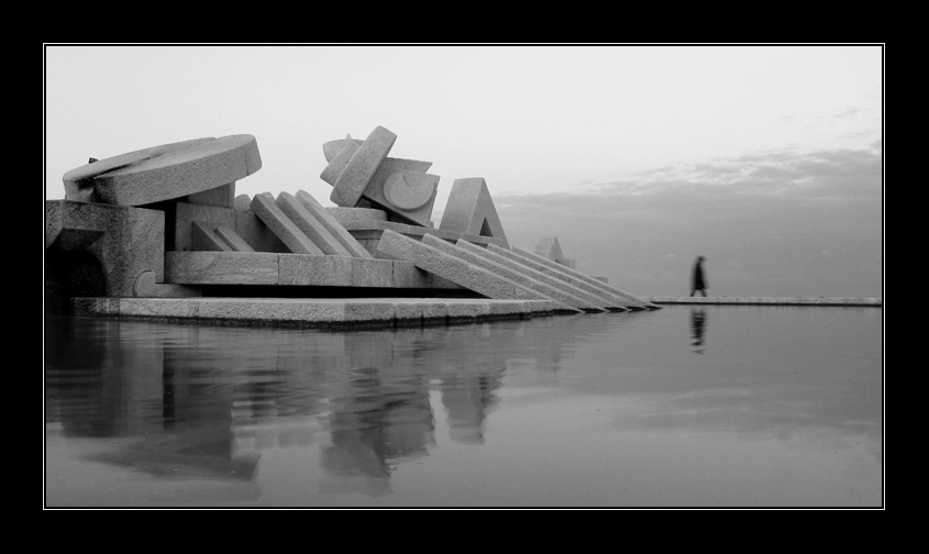 Piacevolmente composta e resa in B&W (per le migliorie tecniche farei una prova sulle basi dei consigli ricevuti, anche se a me non dispiace neppure così...) il taglio, a mio avviso, vede l'orizzonte dividere l'immagine in due parti pressochè uguali... potrebbe essere una scelta voluta per donare stabilità e staticità, trasmettere la caotica calma di alcuni pensieri..... proverei comunque a sbilanciare,spostando l'orizzonte più sù o più giù, chissà magari ti piace di più,magari no....