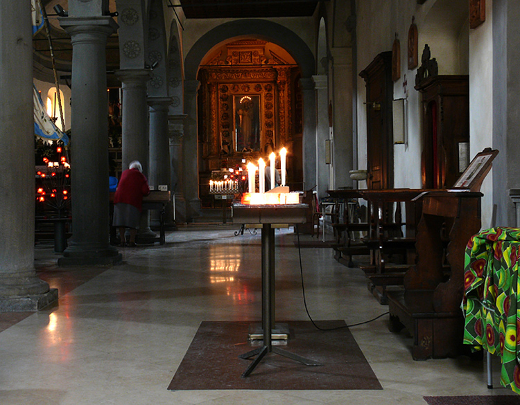 Beh, per la verità potevo evitarlo, e potevo tenere elementi in più a sinistra (un'acquasantiera non male anche se non perfettamente a fuoco). Ma la macchia di colore, nella sua ingenuità pacchiana (come pacchiane sono del resto le candele alimentate elettricamente, con tanto di filo elettrico), mi piaceva come termine di contrasto alla solennità severa del resto. Per cui ho poi deciso di tenerlo dentro. Ma forse hai ragione.