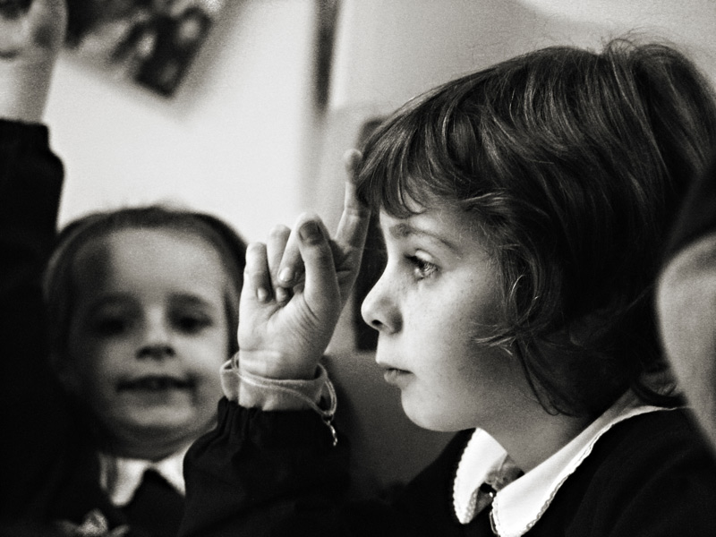 E dolcissima l'espressione del bimbo in primo piano, che chiede la parola con esitazione, in buffo contrasto con la sicurezza di quello sullo sfondo.