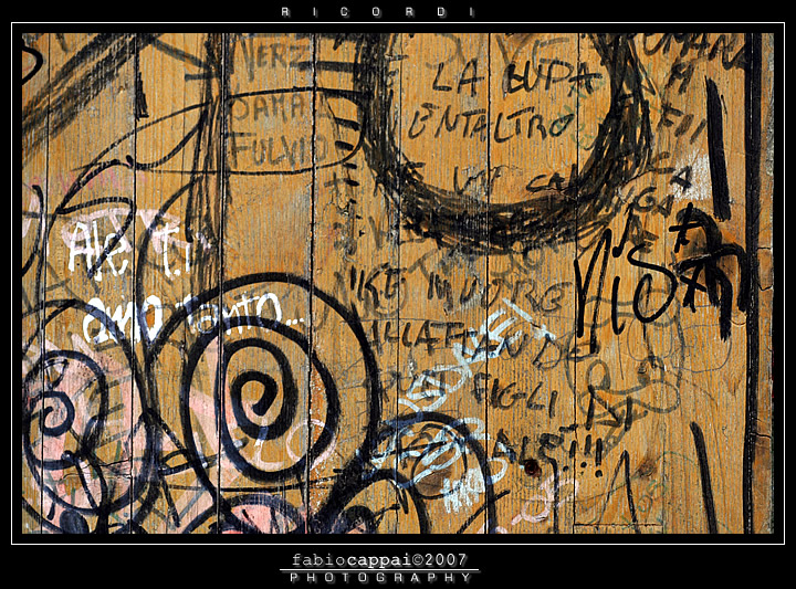 graffiti urbani di varia forma e contenuto, frasi amorose, insulti e invettive..... esclamazioni gergali coloritissime e nostalgiche quanto effimere dichiarazioni amorose..... anche se ne troviamo mille di scorci come questo... ti sei soffermato a congelarne uno.. che forse fra breve sbiadirà insieme a ciò che ha spinto gli autori a tracciare le scritte.....