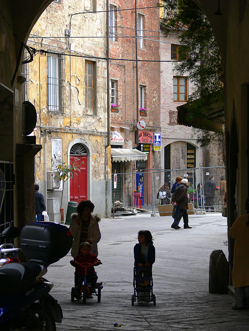Pisa. Via Domenico Cavalca (zona dei mercati di frutta e verdura) dall'arco di Piazza delle Vettovaglie nel periodo (lunghissimo) di restauri che ci ha restituito alla fine, ahimè, una piazza del mercato snaturata e 'modernizzata', senza più gli originari banchetti coperti artigianali, sostituiti, ri-ahimè, da più razionali coperture moderne in tela e metallo che si aprono a manovella... Lumix DMC FZ30, f/4, 1/60 sec, ISO 80, lungh. foc. 140 mm equiv., 1/4/2006 ore 17:07