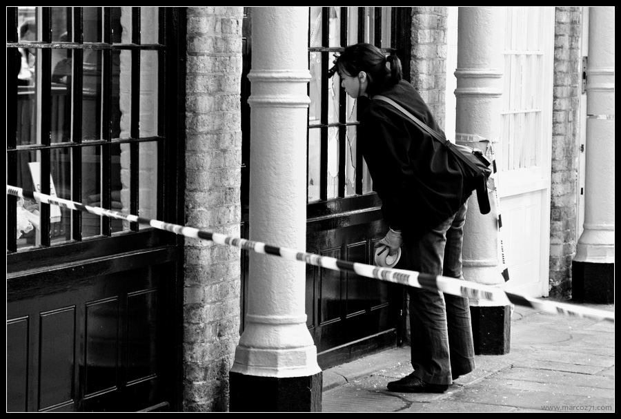 furto o atto vandalico la scentifica indaga non ci ero arrivato subito infatti pensavo di criticare il fatto che il nastro che taglia il fotogramma era veramente una cosa brutta ... poi guardo la ragazza ha i guanti e un nastro in mano ..e guarda attraverso i vetri rotti e tutto magicamente mi e' chiaro la scena del crimine!!!  |