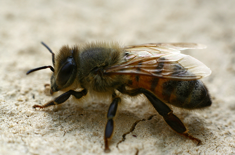 Ottima macro, ma il posatotoio chiaro ha sottoesposto l'ape.