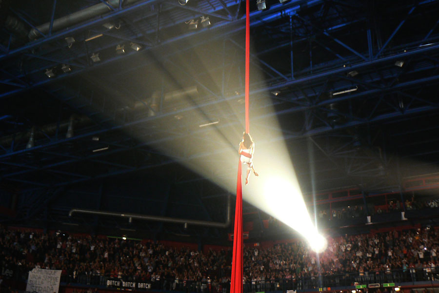 bello il fascio di luce che sembra immobilizzare l'attimo circense, di effetto, come bello e' il nastro rosso che taglia l'inquadratura. Possibile che penda un po', o e' il mio monitor non a squadro?