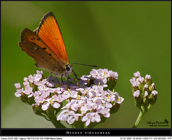 Farfallina di difficile avvicinamento, è la mia preferita per il colore rosso-arancio e per la sua vitalità, è sempre in movimento non si ferma quasi mai così a lungo da poter effettuare scatti ragionati