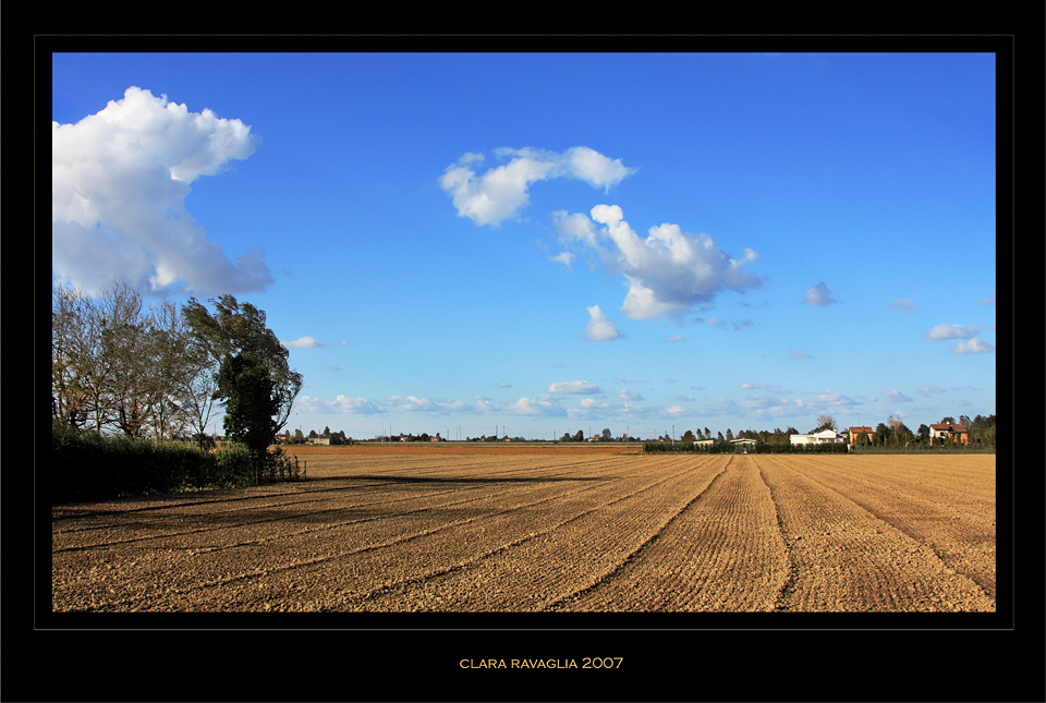 | Citazione: | bellissima la composizione. I solchi creno coma una texture e il cielo limpido con quelle nuvolette dalle forme bizarre sono di una limpidezza impressionante. Altrettanto forte è la sensazione del vento grazie agli alberi piegati....